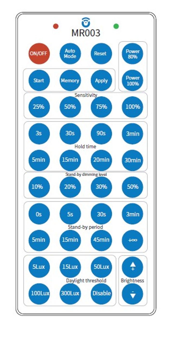 º Remettre le capteur à son réglage par défaut (3s de temps de maintien, 0s de période d'attente, lux désactivé, 100% de sensibilité).Puissance (80%/100%) ).